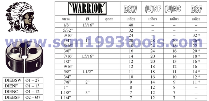 WARRIOR ต๊าปกลม ไดต๊าปตัวเมีย ตราคนป่า ชนิดนิ้ว BSW/UNF/BSF/UNC